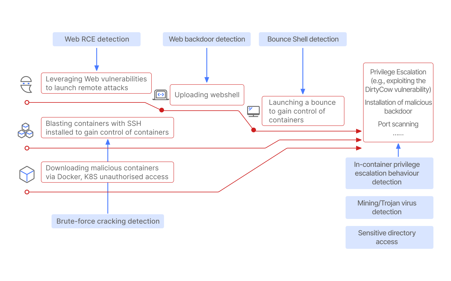 By monitoring process creation, file changes and other behaviours within containers, Yulevo Sentry -Cloud Native Security Platform obtains behavioural characteristics, which are then examined by Yulevo's detection engines in order to detect viruses, mining, Webshell and other attacks in containers.